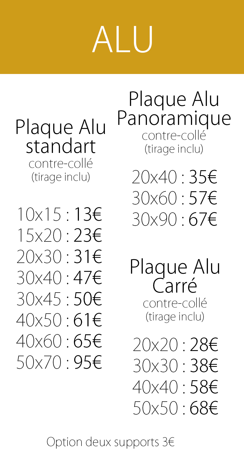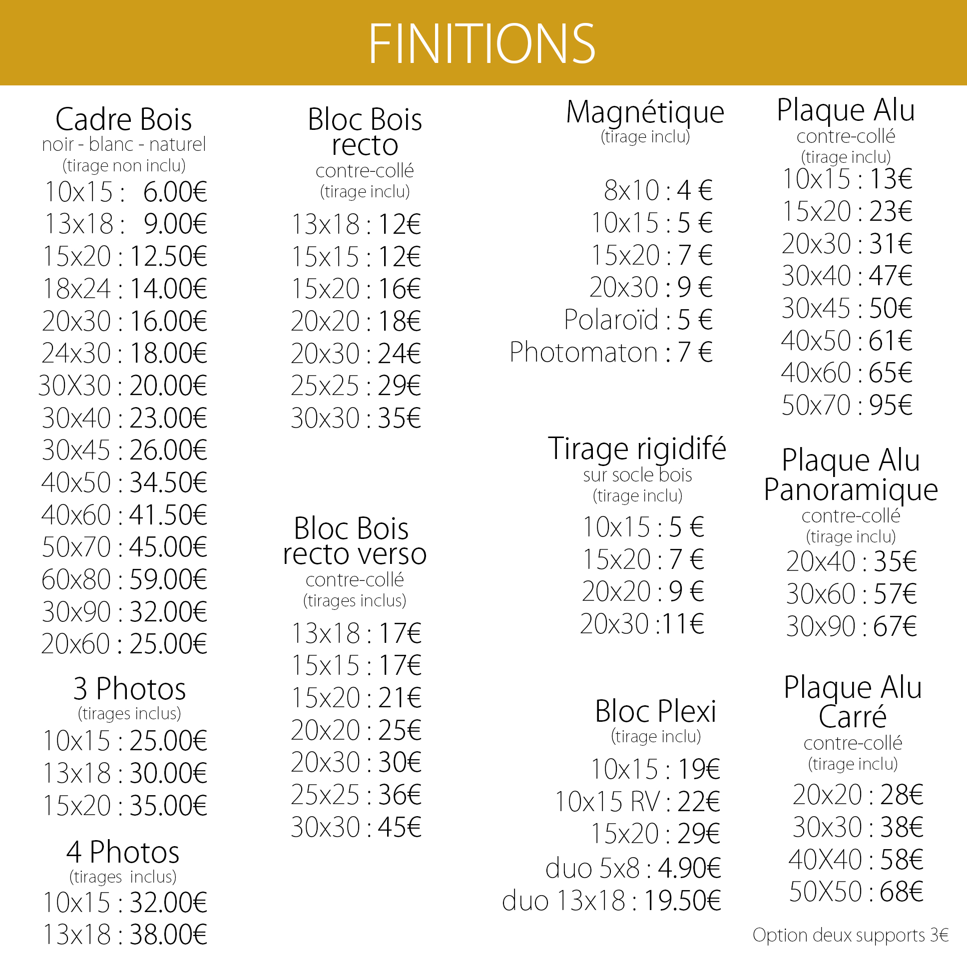 Afin de sublimer vos clichés, différentes finitions sont disponibles : cadres, plaques d’aluminium, de dibond, bloc bois…