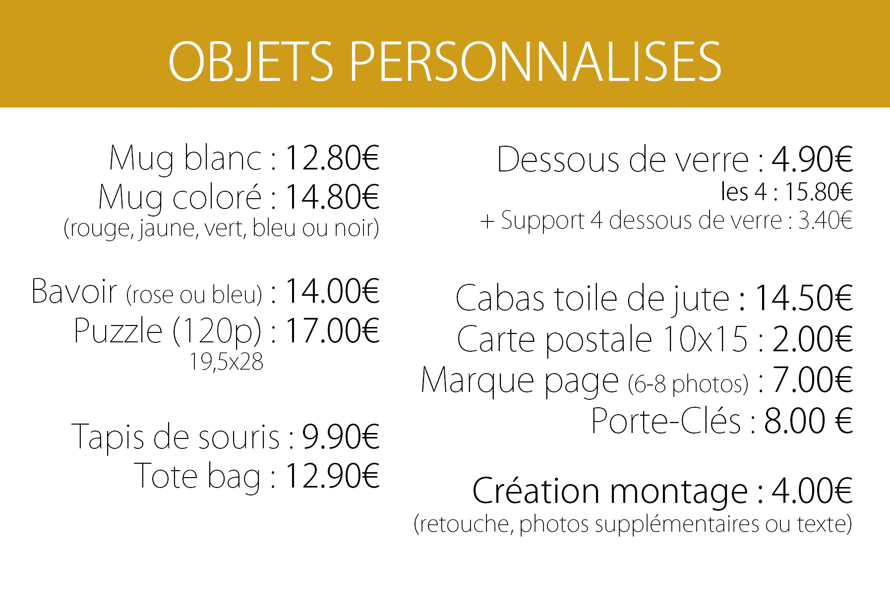 - Des objets 100% personnalisés (Mug, porte-clé, puzzle, tapis de souris, …)